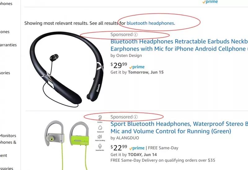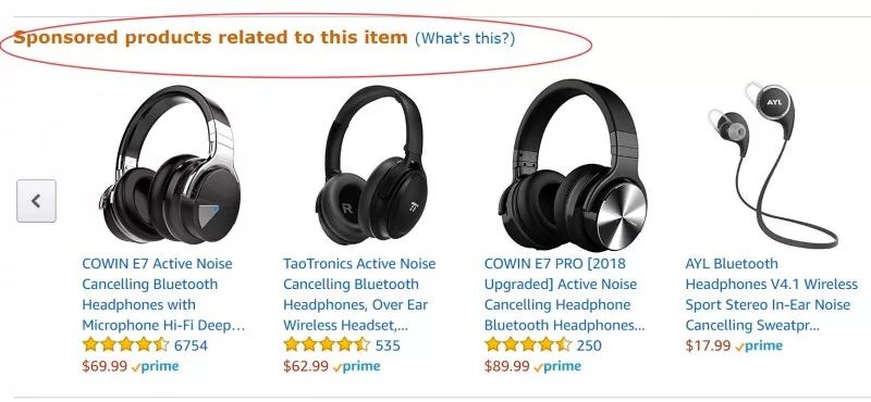 由上图可知,listing关键词主搜索页面,自动广告也是会出现的。类似手动广告一样。不过我这里多说一句,比如一个词Bluetooth headphones 在自动广告的ad rank , 是远远不如把 Bluetooth headphones 设为手动匹配的权重高的,毕竟自动是根据亚马逊的认知来切换,亚马逊会尽可能的去猜测和认知,跑的词面都会比较大,不可能像手动那样集中预算,集中火力。