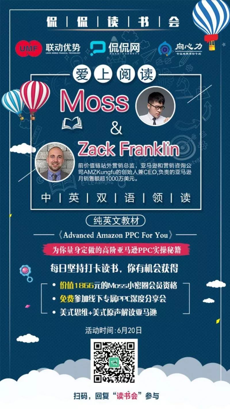 朋友们,侃侃读书会第二期读书打卡活动已经开始报名了。本期,我将携手我的老朋友:前价值链营销总监Zack Franklin,中英双语共读英文原版《Advanced Amazon PPC for You》,为大家全方位讲解“亚马逊PPC实操修炼秘籍”。
