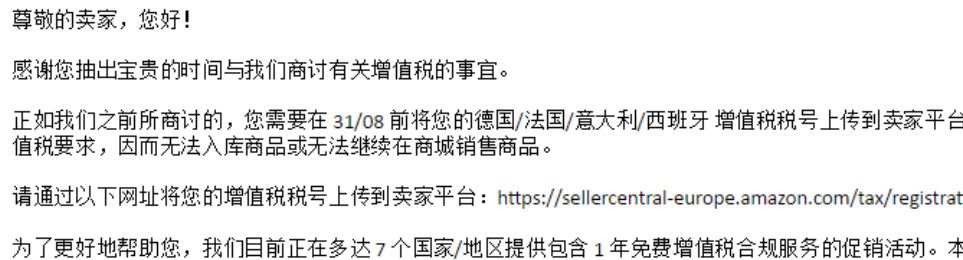 版本1:有卖家3月中旬就收到邮件,称30天之内上传税号,否则封号。