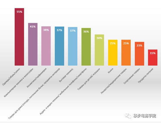 俄罗斯消费者几乎网购所有东西,其中需求最大的产品是衣服、鞋子,有55%的受访者网购此类产品,随后是电脑设备及配件(41%)、化妆品(38%)。