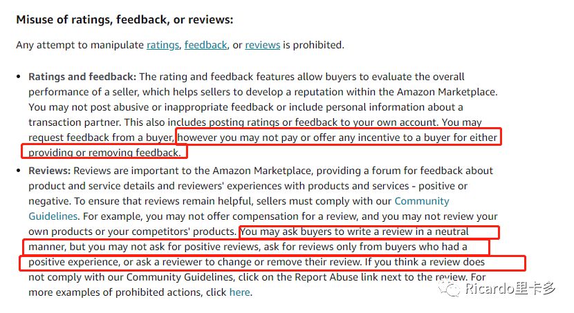 从这两段内容可以很清楚的看到,无论是feedback还是review,亚马逊都明确提到了买家是可以发送索评邮件的,但是要符合真实可信的原则,不能试图去操纵评论,这也符合亚马逊一贯的政策方针。