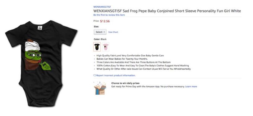 其中,在报告中概述了亚马逊上一些类似Pepe the Frog形象的和具有纳粹用品这样的“无力和不充分执行”政策。虽然报告中提到的几种产品已从其网站上删除,但类似这样的产品仍然存在。