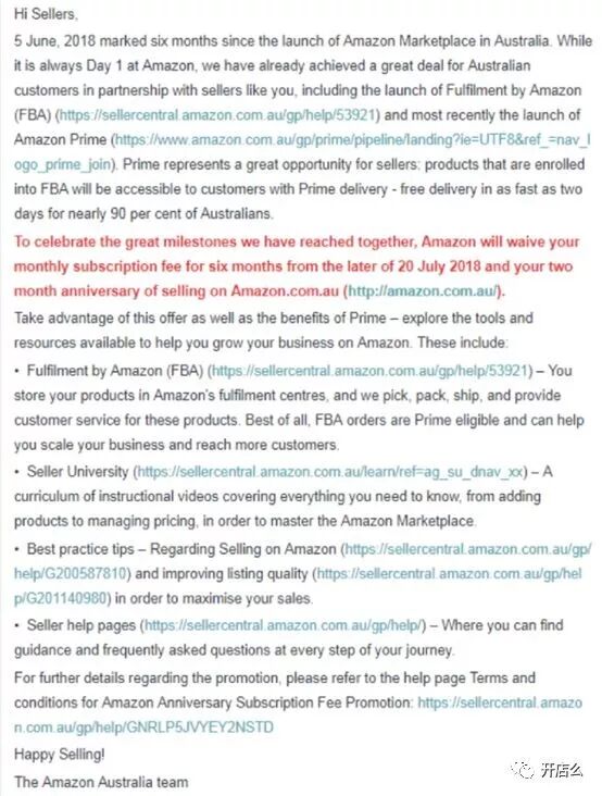邮件称亚马逊澳洲站推出已经快大半年了,各项服务都在发展和完善中。为了庆祝澳洲站取得的进展以及为了携手澳洲站卖家共同发展,从今年7月20日起,为已在亚马逊澳洲站开店满2个月的卖家免除后续6个月的店铺月租费!卖家可以免费使用平台的功能进行业务拓展,比如FBA,卖家大学,卖家支持等。这项政策对目前已经在平台上销售的澳洲站卖家来说,无疑是十分有利的。要知道使用专业销售计划的澳洲卖家每个月都要付49.95 澳元,而6个月就是将近300澳元,节省的成本相当可观!