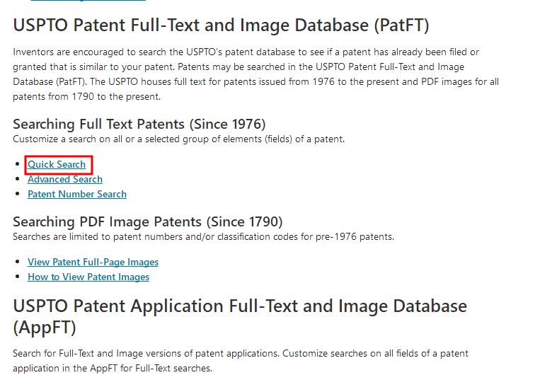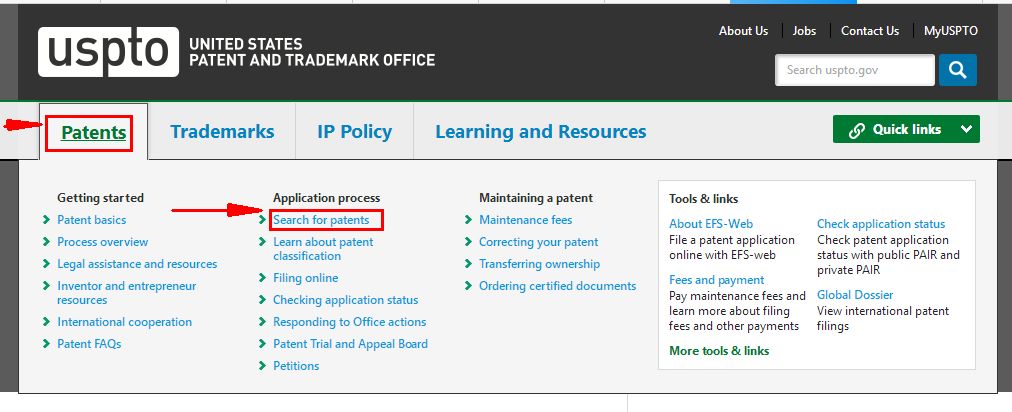 首先,进入USPTO主页,将鼠标移动到“Patents”选项: