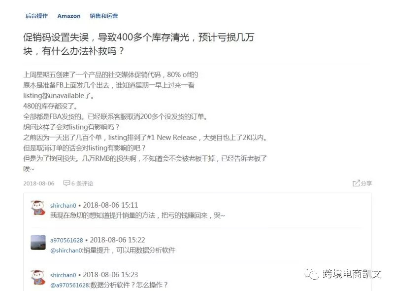 再来看看论坛上看到一个帖子,一个卖家反映促销折扣设置错误,导致400多个库存直接被撸空预计亏损几万。