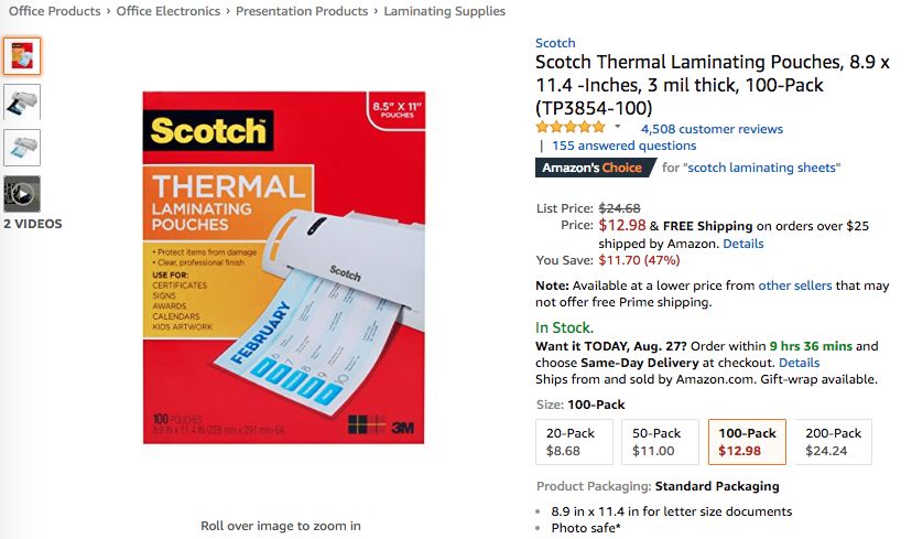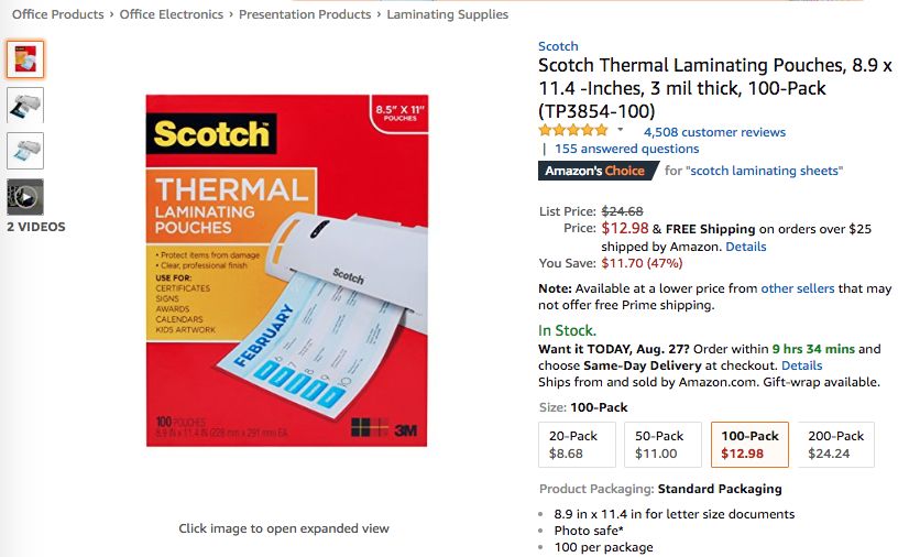 此外骆探长(shujumai.com)发现,一款品牌为Scotch的热塑封 袋产品也凭借着评论平均星级4.8的超高口碑在上周杀入榜单前列——产品的一周平均排名同样达到3.86,并在8月26日成功抵达Best Sellers榜单第二,同类型产品的后续市场潜力同样值得关注。