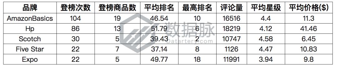 可以看到,在上周Office Products品类的Best Seller榜单中, 亚马逊自营品牌AmazonBasics与大品牌Hp再次一路领跑,分别取得了104次与86次进榜位居品牌综合排名前二。与此同时骆探长(shujumai.com)发现,胶带品牌Scotch同样在上周维持着稳定的榜单发挥,品牌的五款商品在7天中共进榜30次,商品的平均星级高达4.58,位居品牌综合排名第三。