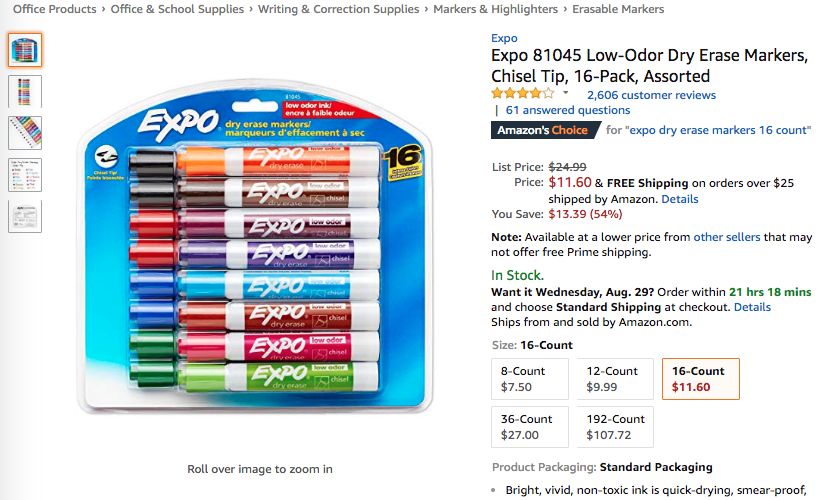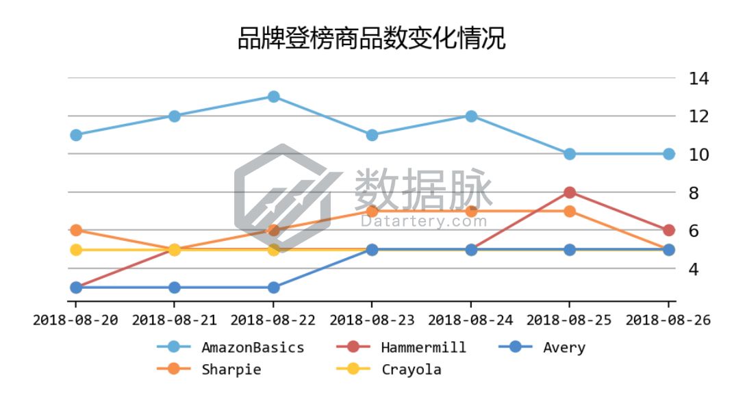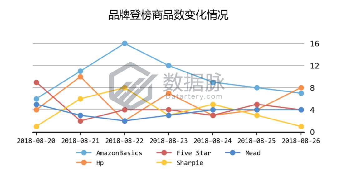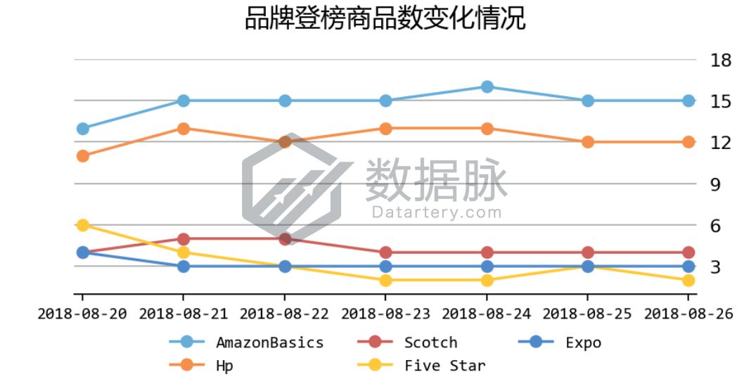 可以看到,在上周Office Products品类的Movers & Shakers榜单中, 来自品牌Expo的一款干擦马克笔16件套产品自8月20日开始连续六天跻身榜单,扛住了评论星级3.9的口碑压力,成功夺得品牌综合排名首位;