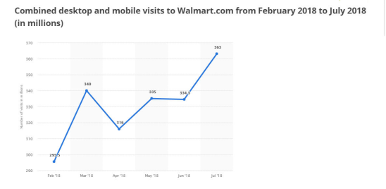 从2018年2月到7月,沃尔玛官网的总访问量达到了3.63亿,该网站是美国领先的品牌之一,且依然不断发展壮大。