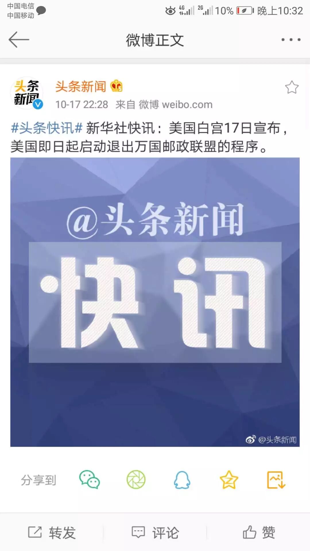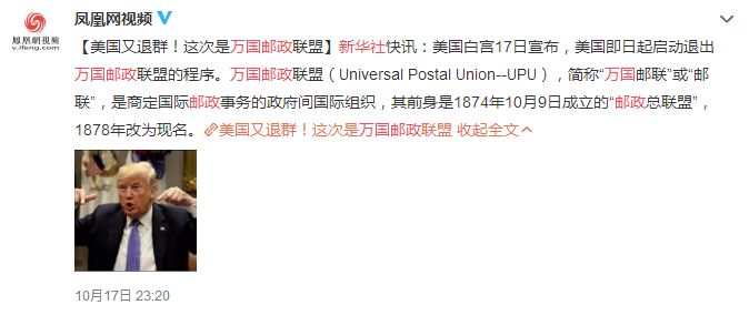 美国白宫17日宣布,美国启动退出万国邮政联盟程序;如未来一年未能与万国邮政联盟达成新协议,美国将会退出。
