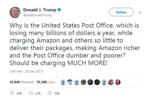 ▲特朗普推特要求USPS给亚马逊涨价