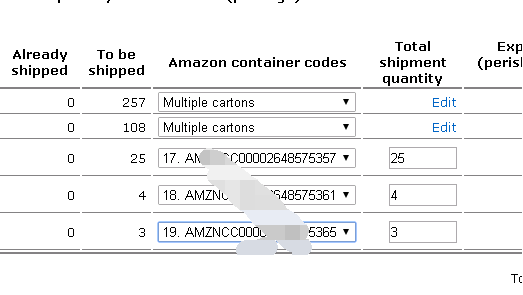 6.这里见详细的,这里有19 个箱子编号,AMZNCC 开头的,一个编号代表一个箱子。我这个A 产品有200 个,B产品有100 个,我现在的箱子只能一箱装150 的话,就是A 产品直接选择一个箱号,后面填写150的数量;那么 A 产品剩 50 个,B 产品还有 100 个,这两个合一箱怎么操作呢?看下面