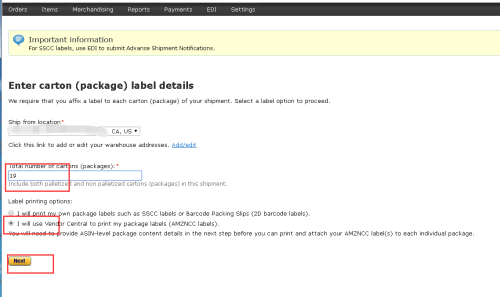 4.在这里填写你的订单发货地址,多少箱,以及外箱标签等,这里的发货地址是选择的,不是直接填写的,所以你要在账号设置那里填写好你的发货地址;这个订单分多少箱,这里你要计算好你这个订单要分几箱发,箱子都是不 能超重,超长的,还要就是根据公司要求咯,有箱规,或者说这个订单里有普货,有带电的要分开,总之就是这个 订单要分几箱,创建发货前先算好,这里直接填写几箱就可以;外箱标签就选亚马逊生成的就可以,AMZNCC, Next