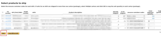 5.这里就关于分箱了,如果你这个订单只有一个产品,上一步也就写1 箱,那么这里操作就很快了;我们这里是有5 个产品,产品数量也不同,有的产品是要混箱装一起,就是要分箱了。我上面写的是19 箱,那么亚马逊就会给我