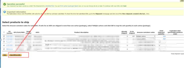 10.下一步的话,这里有 Save ASN as Draft 和 Next,你先保存为草稿的话,如果你还没有发货,没有运单号,只有后 面再填写提交了,如果你有运单号,直接下一步就继续填写就可以了。不要问我可不可先填假的运单号,后面再改 回来,自己去测试啊,我只能说一开始是可以,后面又不可以了,但是在做发票的时候可以填回正确得运单号。