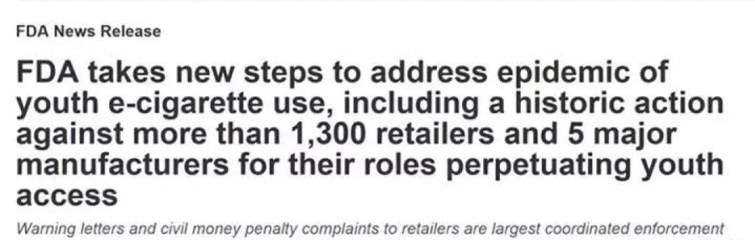 就连美国监管当局也曾放风,如果不能控制电子烟在青少年人群中的泛滥,他们将把电子烟全部下架。今年美国FDA在全美范围内,对向未成年人销售电子烟的厂商进行排查,对1300多家零售商和五家主要生产商发出了多封警告信和民事罚款单,罚款金额从279美元到11182美元不等。