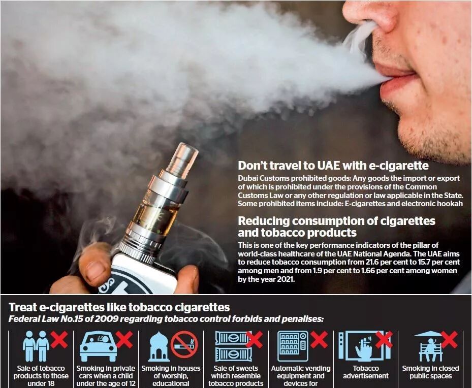 根据迪拜的法律规定,任何人在迪拜商场等公共场所使用电子烟都将被处以2000迪拉姆的罚款。商场保安人员也有权向警方举报。迪拜海关禁止进口和出口电子烟。
