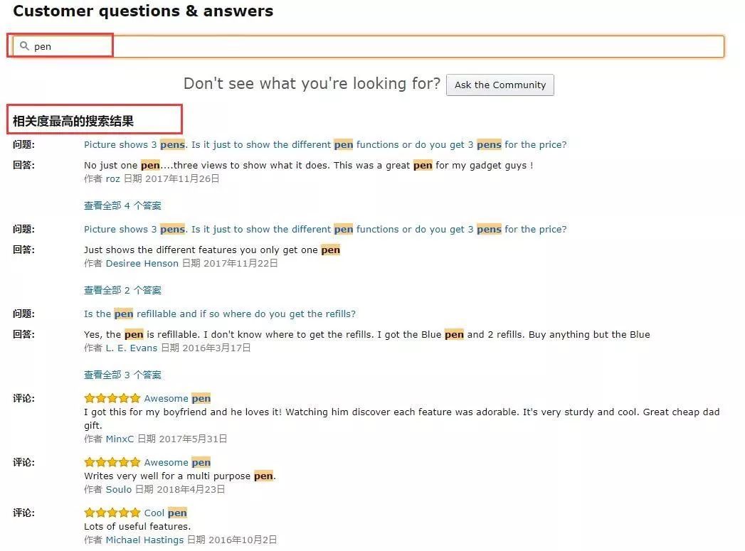 来看看亚马逊是怎么收录QA里面的关键词,从搜索框输入关键词pen,那么在这个listing所有的question和 answer当中,带有关键词pen都会被展示出来。
