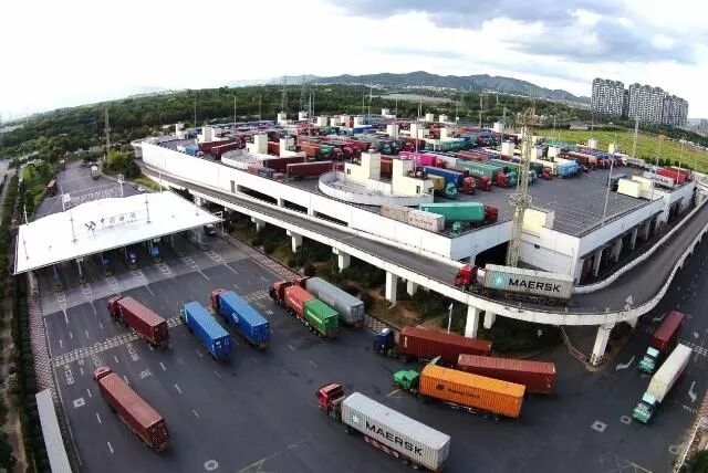 浙江义乌港,已完成义乌海关监管准备出场的集装箱货车。