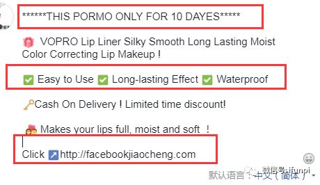 首先我们将FB广告文案拆解,通常典型的转化广告包含的内容一般有几个部分,【宣传语】+【产品描述】+【打折促销】+【链接】+【素材】+【标题】+【CTA】 +【其他】,下面我们来分别谈谈各个模块。