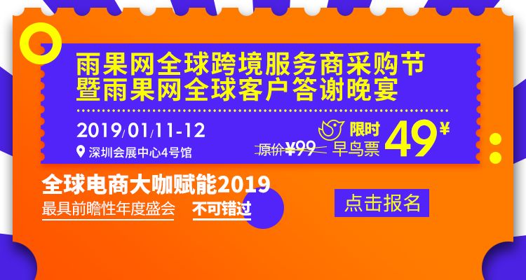 重磅!2019雨果网全球跨境电商服务商采购节进入倒计时!!!点击“阅读原文”查看详情,更多早鸟票等你抢!2019平台新风向,市场新趋势,运营新干货,尽在2019年1月11-12日(深圳)