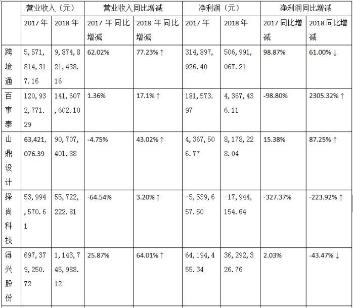如上表所示,相比去年同期,2018上半年浔兴股份和跨境翼归属股东的净利润均出现不同程度的下降,其中择尚科技净利润有一定的增长,但是与跨境翼一样,持续两年都出现负增长。其它部分上市公司尽管营业收入保持增长趋势,但也出现净利润增速放缓的迹象。