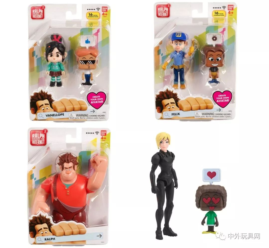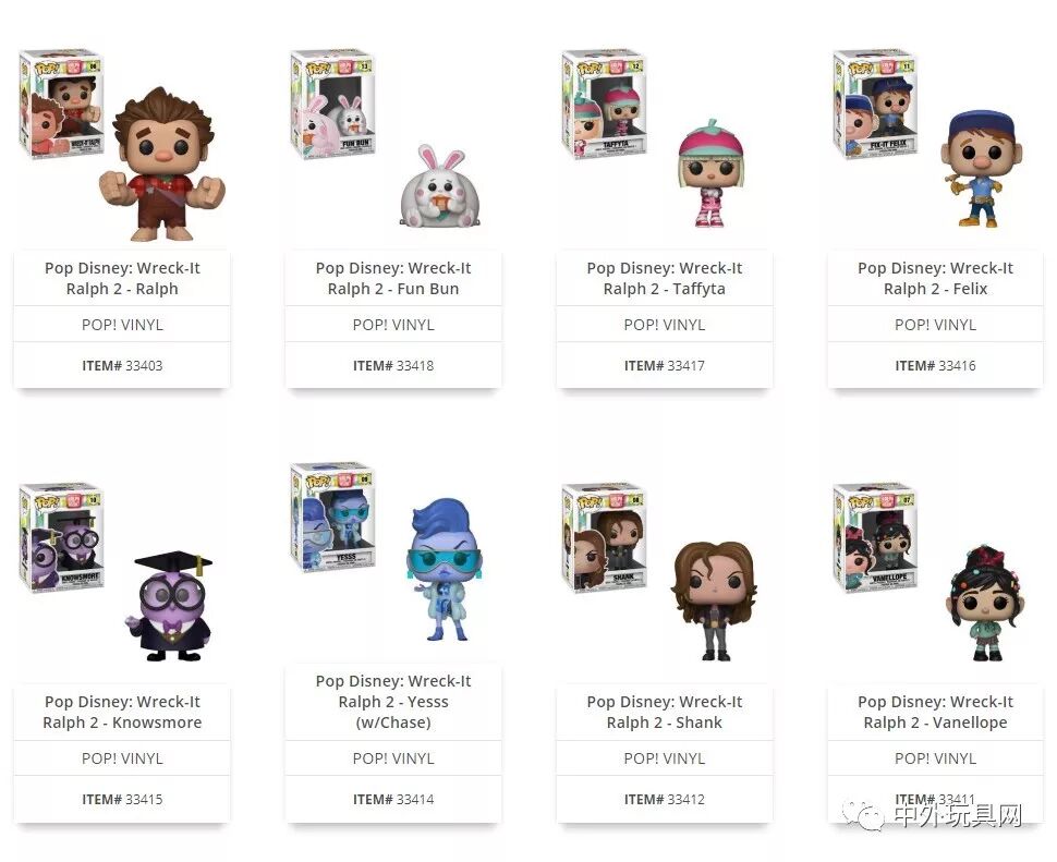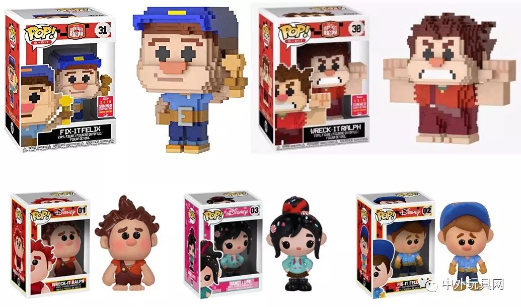Funko Pop的POP! VINYL的Disney线也更新了一系列无敌破坏王角色的卡通人仔,包括拉尔夫、吃松饼的兔子、《甜蜜冲刺》中的游戏角色太妃糖、快手阿修、万事通、赞姐、闪姐、云妮洛普。