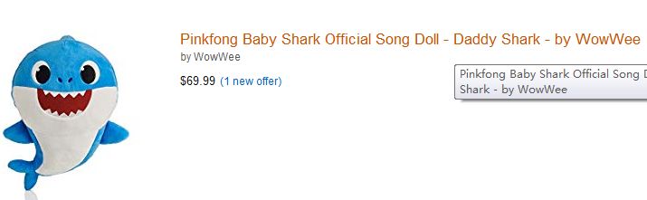 如今,亚马逊上仍有一些独立卖家在售Baby Shark玩具,这些玩具是小型的、可折叠的Baby Shark,它们的最初定价是7美元左右,现在售价约为45美元,价格提升了6倍之多。