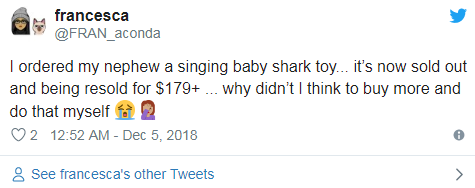 在推特上Baby Shark也相当火爆。一些家长为错过了Baby Shark而感到愧疚;还有买家称谢天谢地,Baby Shark终于售罄了,我可以从购物车中删除了;也有一些买家对亚马逊上独立卖家大肆加价表示愤怒。