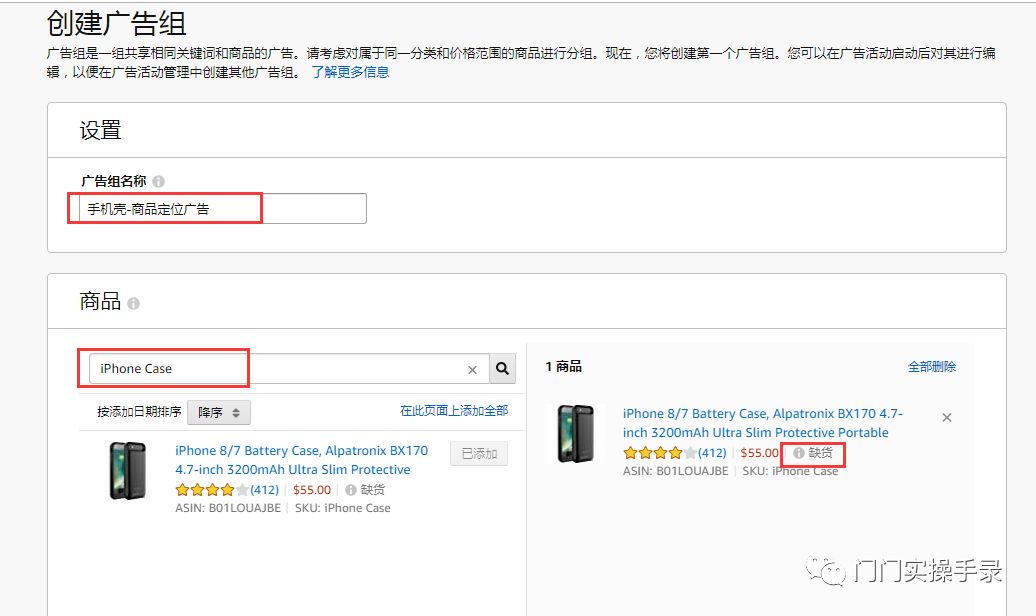 注意这里通过你店铺里面商品的ASIN或者SKU来搜索选定你准备投放广告的商品(PS:FBA有库存做广告才有效大家都知道吧!我这里是做演示所以缺货状态)
