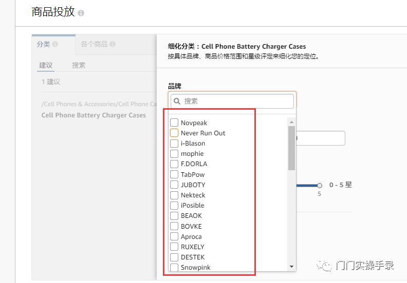 在类别标签中,您可以定位基于与广告产品相关性的建议类别。您也可以按类别搜索,或者您可以浏览搜索字段下方列出的类别。您还可以按品牌,价格范围和评论星级来细化类别。