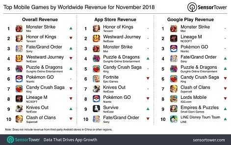 除此之外,Mixi 的《怪物弹珠》占据着全球游戏收入榜的王座,同时其还是 Google Play 上的营收冠军。腾讯的《王者荣耀》则摘走了 App Store 的盈利王称号。