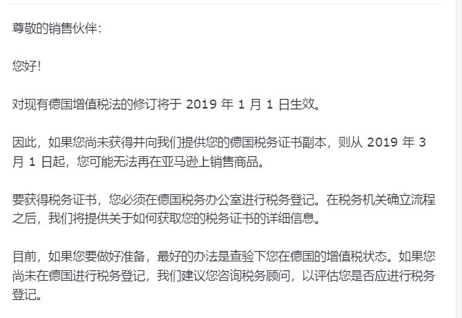 这两天,不断地有老铁找到我,给我看下图这个邮件,问我到底应该如何是好?我相信这封亚马逊官方发的德国VAT警告信,很多做欧洲站的老铁应该都收到了吧?