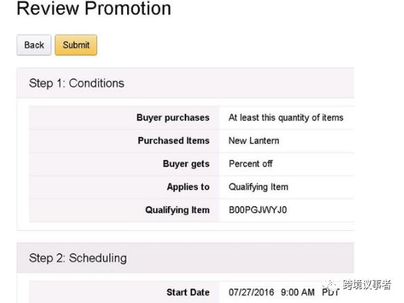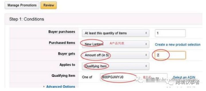 这个A产品,是要进行捆绑的产品,也就是说,我们要利用的是A产品的流量,不要搞混了,设置了这个之后B产品(要推广的产品)会显示在A产品listig的产品页面中;设置促销类型:是减免金额还是折扣;Applied To: 选择 Qualifying Item;Qualifying Item: 填上被捆绑的B产品的ASIN;