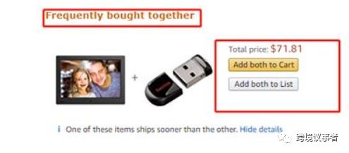 亚马逊中有一个推荐是Frequently Bought Together(经常一起购买),是系统自动抓取最适合搭配销售的产品,不过,据其他卖家分享,通过多台电脑(不同IP)人工频繁点击2款产品,模拟消费者的选购过程,也有可能造成这种关联。这种情况下的权重比较高,但这只有在正常关联出单量少的情况下才会奏效,并且要耗费大量的时间与人工成本,是否值得去尝试,卖家要自行检验衡量。