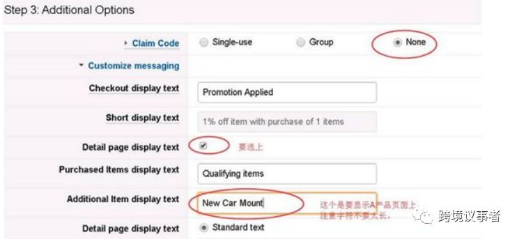 Claim Code这里选择不需要,或者你有需要可以进一步设置;Additional Item display text:这个就是填写B产品在A产品页面上的那个产品描述,注意字符长度不要太长;记得要勾选Detail page display text哦;其他默认不用去改任何东西,然后review确认之后没有问题提交:
