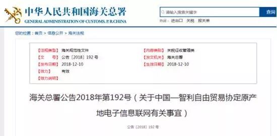 12月11日,中国海关总署发布第129号公告称,为进一步便利《中华人民共和国与智利共和国政府自由贸易协定》项下的货物合规通关,自2019年1月1日起,“中国—智利原产地电子信息交换系统”正式运行,实时传输《协定》项下原产地证书电子数据。