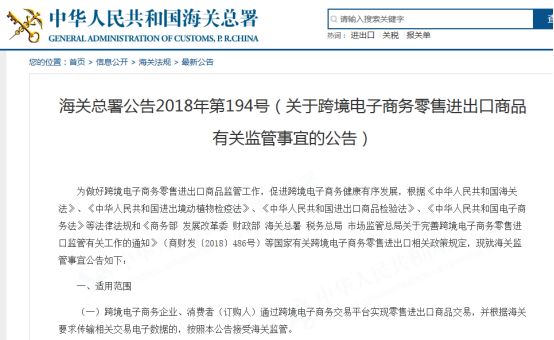 12月12日,中国海关总署发布第194号公告称,为做好跨境电子商务零售进出口商品监管工作,促进跨境电子商务健康有序发展,根据国家有关跨境电子商务零售进出口相关政策规定,公布包括跨境电子商务企业、通关、税收、场所、检疫、查验和物流、退货等八项管理细则。