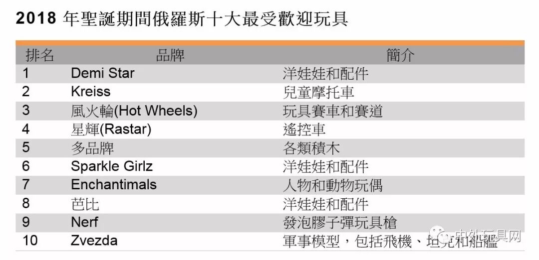 娃娃类产品成为本次榜单的“大赢家”。值得注意的是,捷克品牌Demi Star力压芭比等世界知名品牌,出人意料地夺得桂冠,分析指出,Demi Star虽然知名度较低,但成功秘诀估计在于产品较传统朴素,在俄罗斯只售2.50美元左右,相当于芭比洋娃娃标准售价约四分之一。芭比、Sparkle Girlz和Enchantimals等娃娃品牌也成功入选。