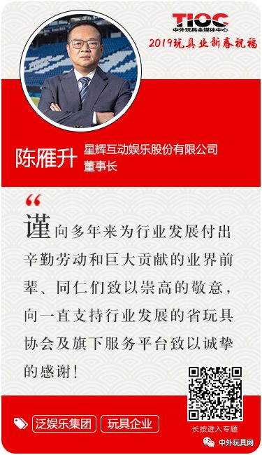 星辉娱乐董事长陈雁升说,在隆重庆祝改革开放40周年之际,谨向多年来为行业发展付出辛勤劳动和巨大贡献的业界前辈、同仁们致以崇高的敬意,向一直支持行业发展的广东省玩具协会及旗下服务平台致以诚挚的感谢!