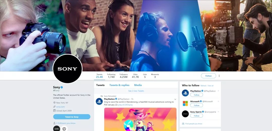 索尼的Twitter账号向我们展示了它涉足的众多领域:影视、音乐、电子产品、游戏等等。作为庞大的商业帝国,索尼旗下拥有许许多多的子账号,而它也非常善于利用旗下多个子账号之间的互动进行交叉宣传,同时丰富自己的内容。在它的Twitter上,经常会有自己旗下账号相互转推的内容,从而达到推广自己旗下多个社交账号的目的。