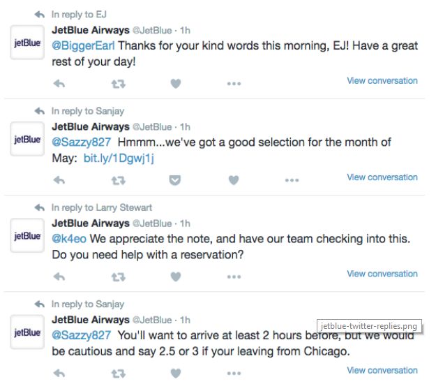 另外,JetBlue还会通过发布推文的方式逐一回答用户提出的问题,并@提出问题的用户。通过这种方式,与用户产生更紧密的联系,更好地维护公司与顾客的关系。