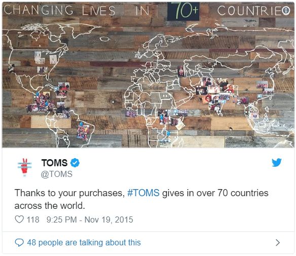 TOMS知道自己的这个特点,也善于利用这个特点为品牌加持,宣传自己在公益事业上的成果,让自己拥有更加良好的品牌形象和口碑。因此有别于其他时尚品牌,在TOMS的Twitter中,公益是非常重要的组成部分。
