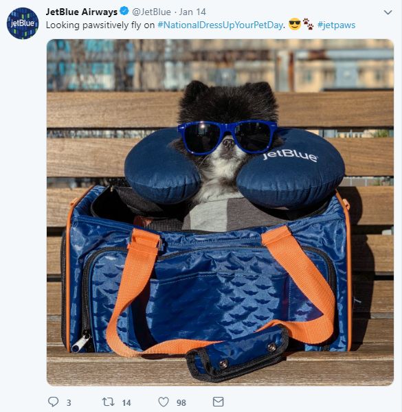 说到成功的Twitter运营,美国廉价航空公司JetBlue经常被点名,因为它一改航空公司沉闷、严肃的语调,经常发布一些搞笑推文或者有趣的图片视频以提高互动量。