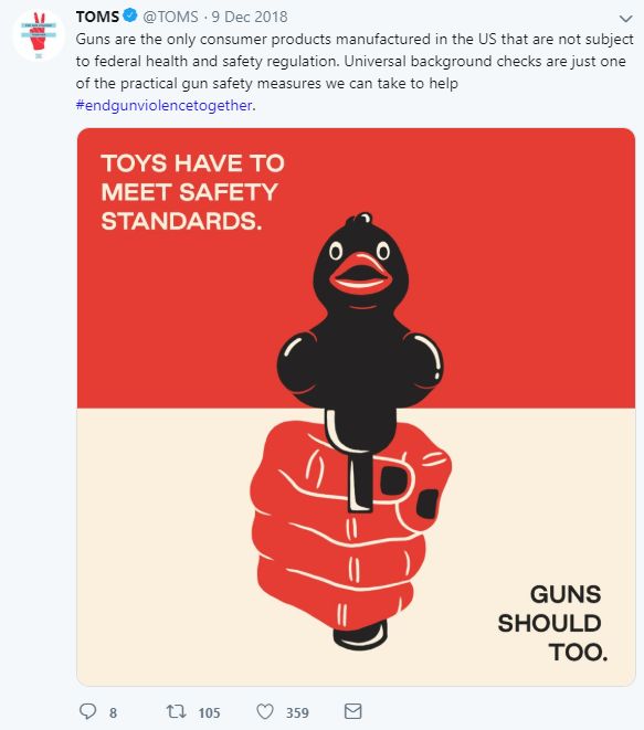 品牌也非常乐意加入或发起各种涉及社会公共利益的运动,比如近期的抵制枪支暴力运动,TOMS不仅把Twitter头像换成了“END GUN VIOLENCE TOGETHER”(一起来结束枪支暴力)的字样,还发布多条推文呼吁民众的关注和参与,并创建标签#EndGunViolenceTogether扩大影响力。