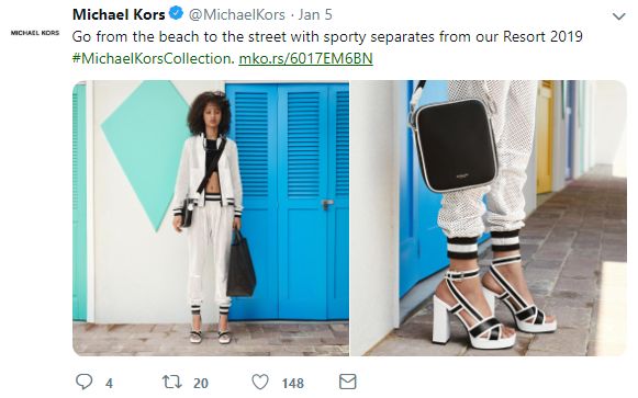 MK还有一个专属的话题标签#MichaelKorsCollection,几乎每一条出现其产品图片的推文里都会带上这个标签。此外,MK也非常重视粉丝的导流,发布好看的模特图或者穿搭贴士的同时,也不忘提供一个直接跳转到官网的链接,提高流量到销量的转化率。