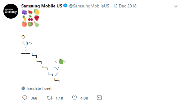 此外,三星手机还会时不时通过emoji表情或颜文字组成一些颇有想象力的图画,简洁巧妙地传递自己想表达的意思,这类推文通常都能收获极高的转发互动量。
