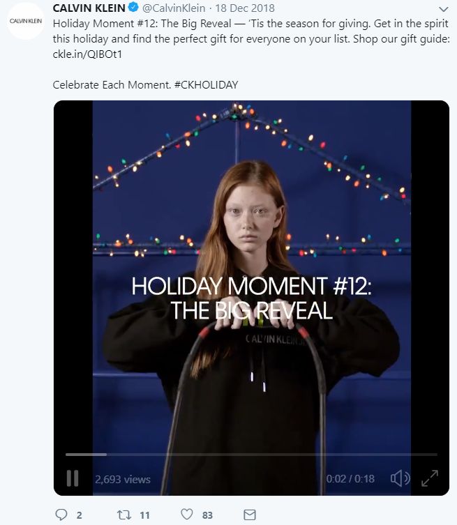 同时,CK在内容的制作上也颇具匠心。18年末节日季的时候,CK推出了Holiday Moment的系列专题,并带上标签#CKHOLIDAY,通过短视频、创意图片等将自家的产品与节日场景结合起来,唤起受众共鸣,从而促进销售。