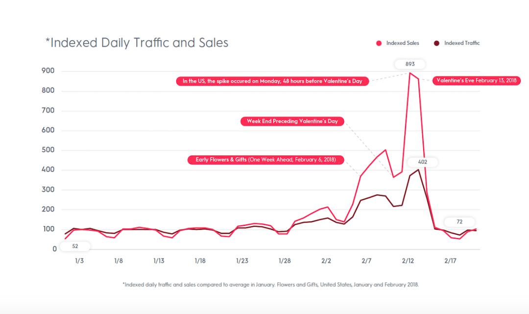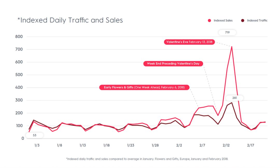 2018年,周末和情人节之间的时间间隔增加了一天(去年的2月14日情人节是周三),节日销售高峰要高于前一年;