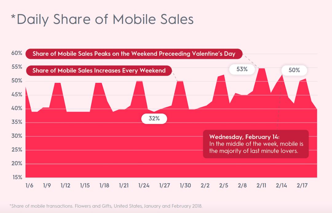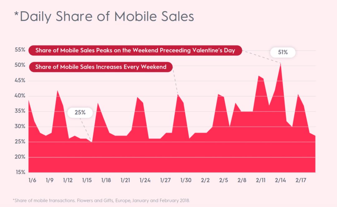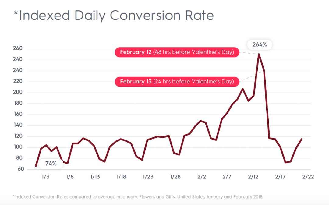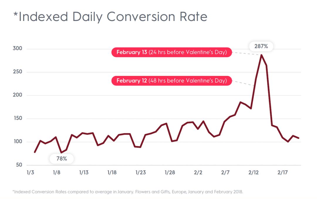 在情人节来临前夕,时间上的紧迫感将使消费者陷入“恐慌性”购物,情人节整体的订单转化率将急剧上升。而且越是在最后时刻,消费者越容易冲动购物,而且也会随之带动移动端的转化率。在情人节节前的最后几天里,美国的转化率比平时高164%,欧洲的转化率比平时高187%。